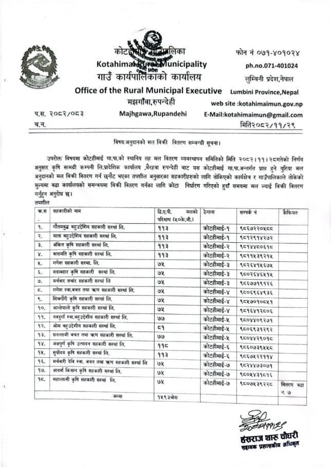 अनुदान मल बिक्री बितरण सम्बन्धमा l